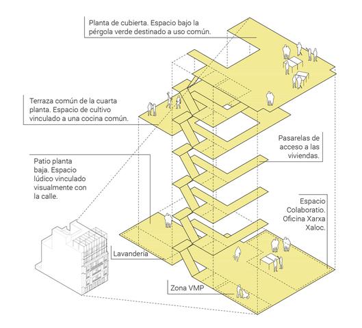 Quant a la resta de l'edifici, es decideix concentrar les zones comunes usables en els espais de major qualitat ambiental: sala polivalent i terrassa en 4 planta i el terrat vinculat a la pèrgola verda i usos diversos. Es considera que són els llocs idonis per a realitzar celebracions o qualsevol acció vinculada a la jardineria o al cultiu participatiu, fomentant la cohesió entre co-habitants. A més, en tractar-se d'espai exterior o espai interior en íntima relació amb aquell, es minimitza el possible escàndol generat en zones comunes vinculades als habitatges i al pati central, a més de facilitar la compacitat de la zona de l'edifici destinat a habitatge, fomentant així l'eficiència energètica.