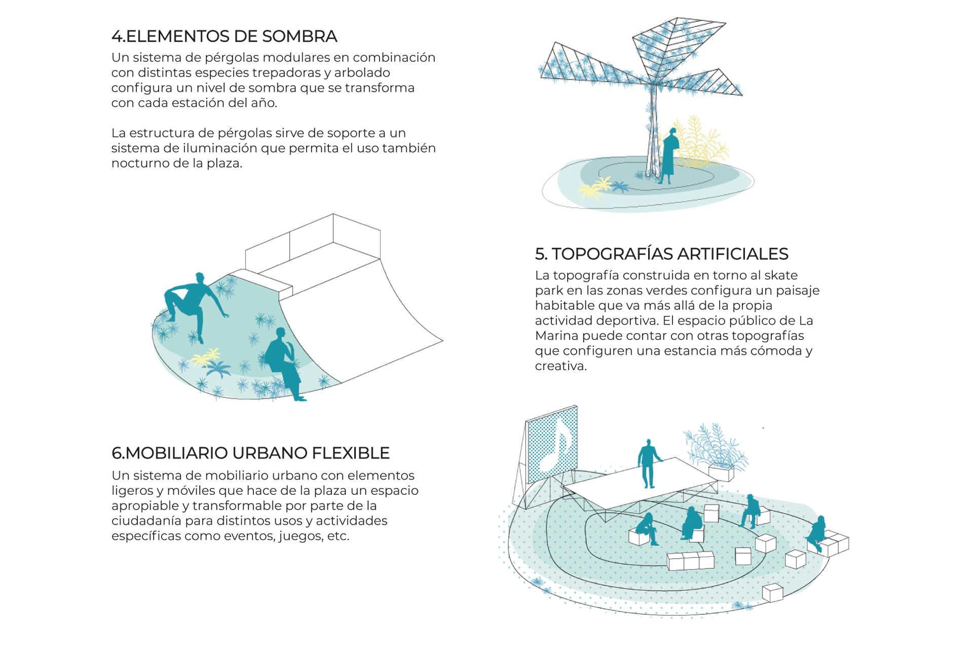-Integración del skatepark. Topografía artificial. El diseño del skatepark pretende resolver su integración con el entorno y con el plano del suelo a través de la generación de una topografía artificial que acoja diferentes usos.